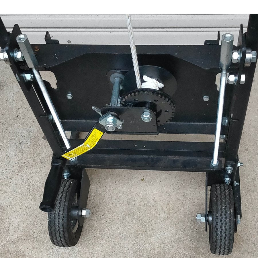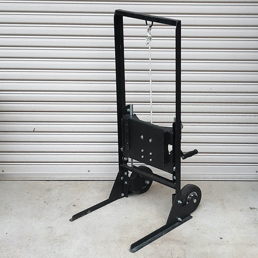 元々は手作りの持ち上げ機を使っていましたが、販売にあたって地元機械メーカーOBの方に設計を行っていただき、構造を一新しました。輸送性、安全性、作業性を考慮した製品となっておりますが、数十キロの巣箱を持ち上げる作業には危険が伴いますので、十分に注意して作業を行ってください。